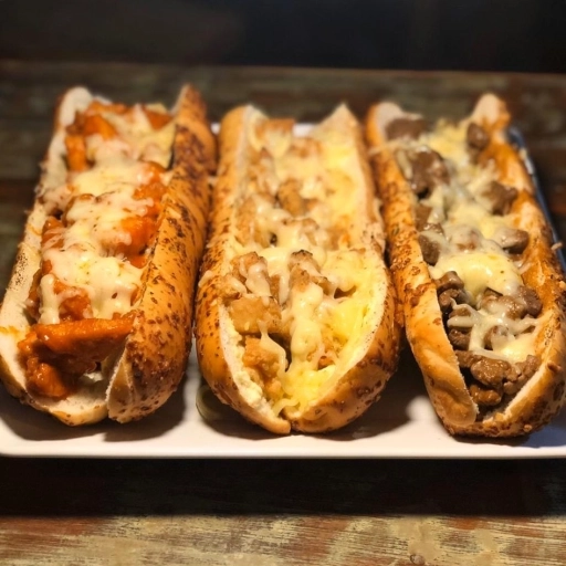 Pão, contra filé, queijo mussarela no maçarico, cebola crispy, batata palha e molho à sua preferência.